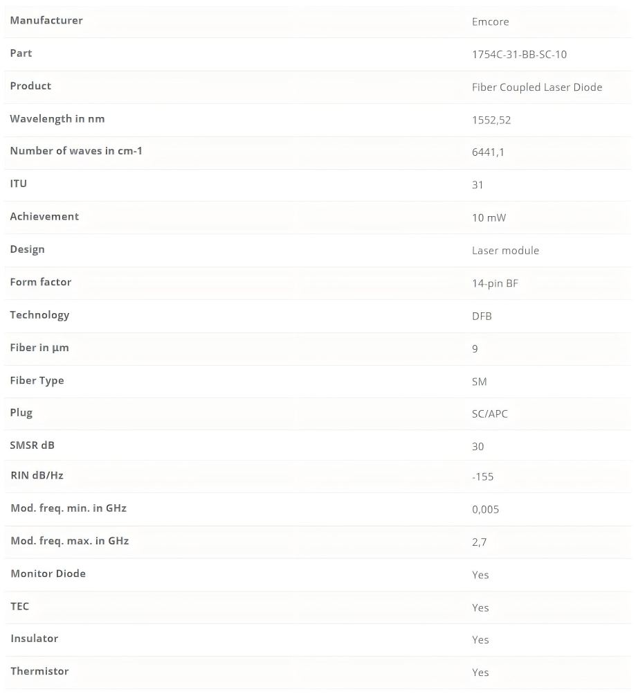 Emcore Fiber-coupled Laser Diode DFB 1552.52nm SC/APC 10mW 1754C-31-BB-SC-10