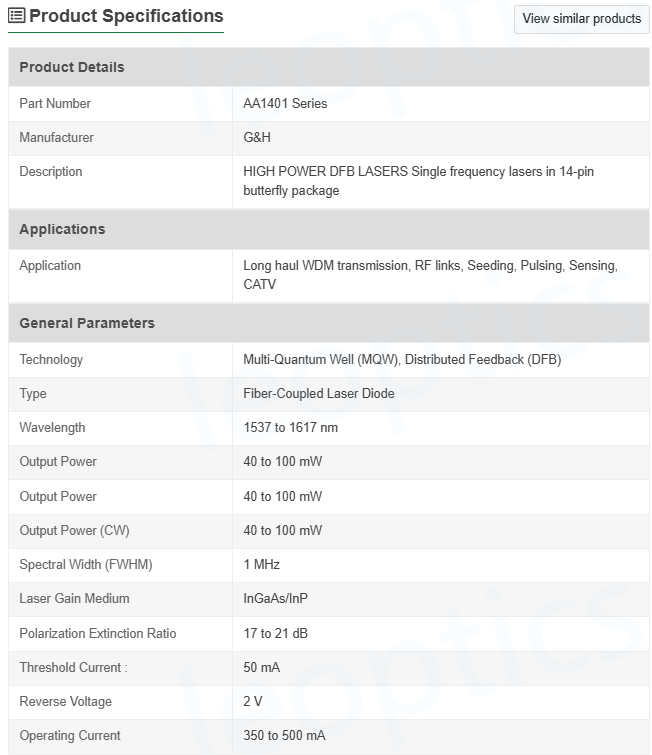 G&H AA1401 Series HIGH POWER DFB LASERS Single frequency lasers 1545nm 80mW