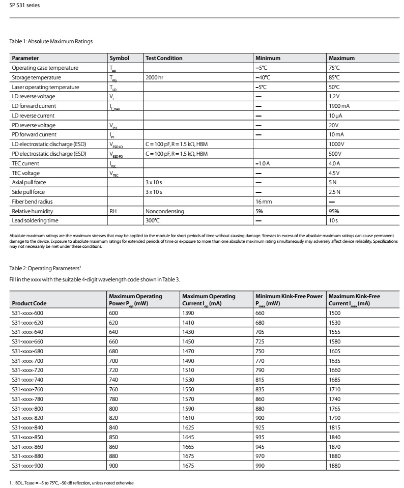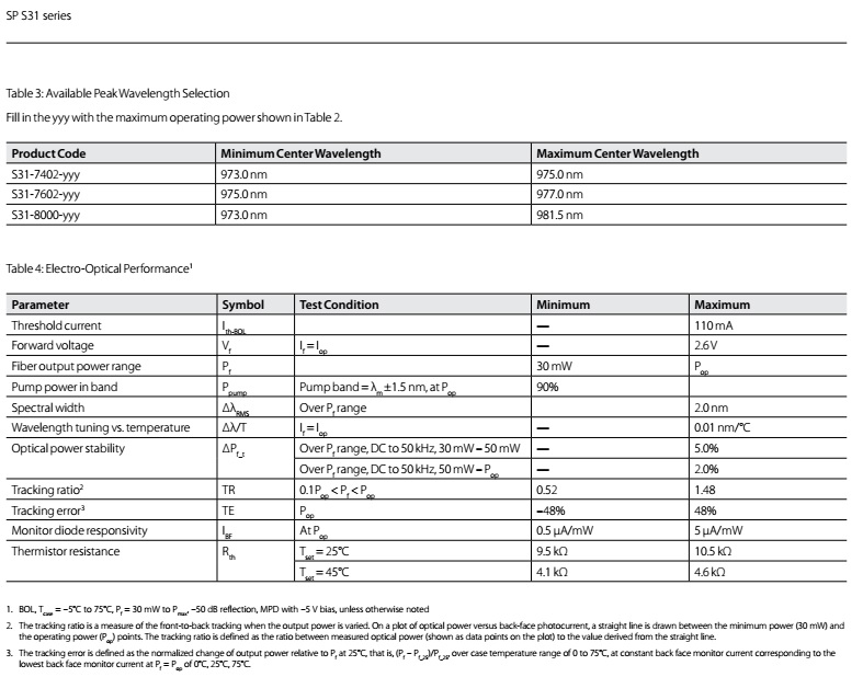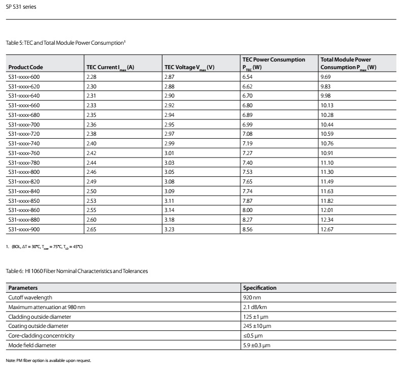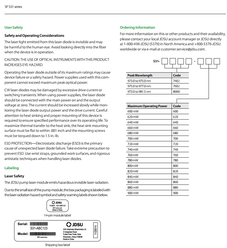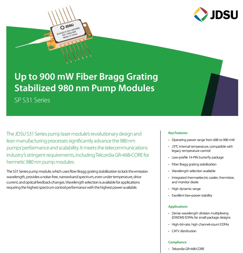 JDSU 980nm Pump Laser Module Up to 900mW Fiber Bragg Grating FBG S31 Series