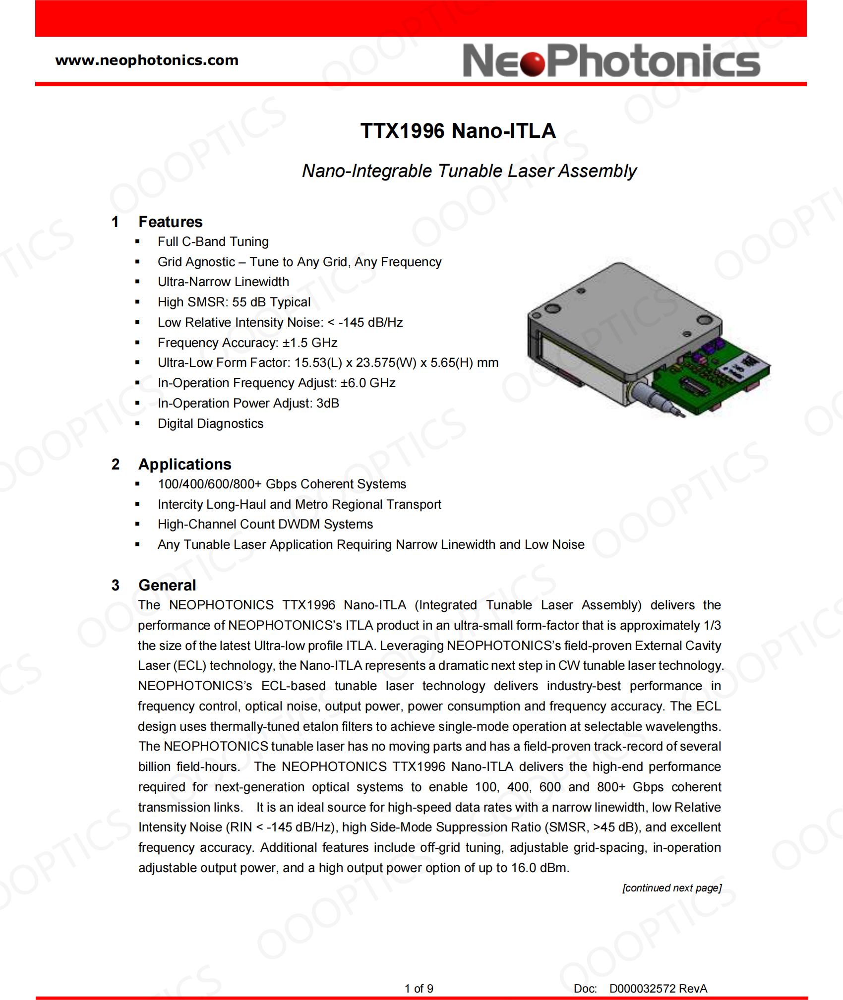 NeoPhotonics nITLA Nano ITLA-TTX1996 17dBm Ultra-Narrow Linewidth FC/APC Fiber