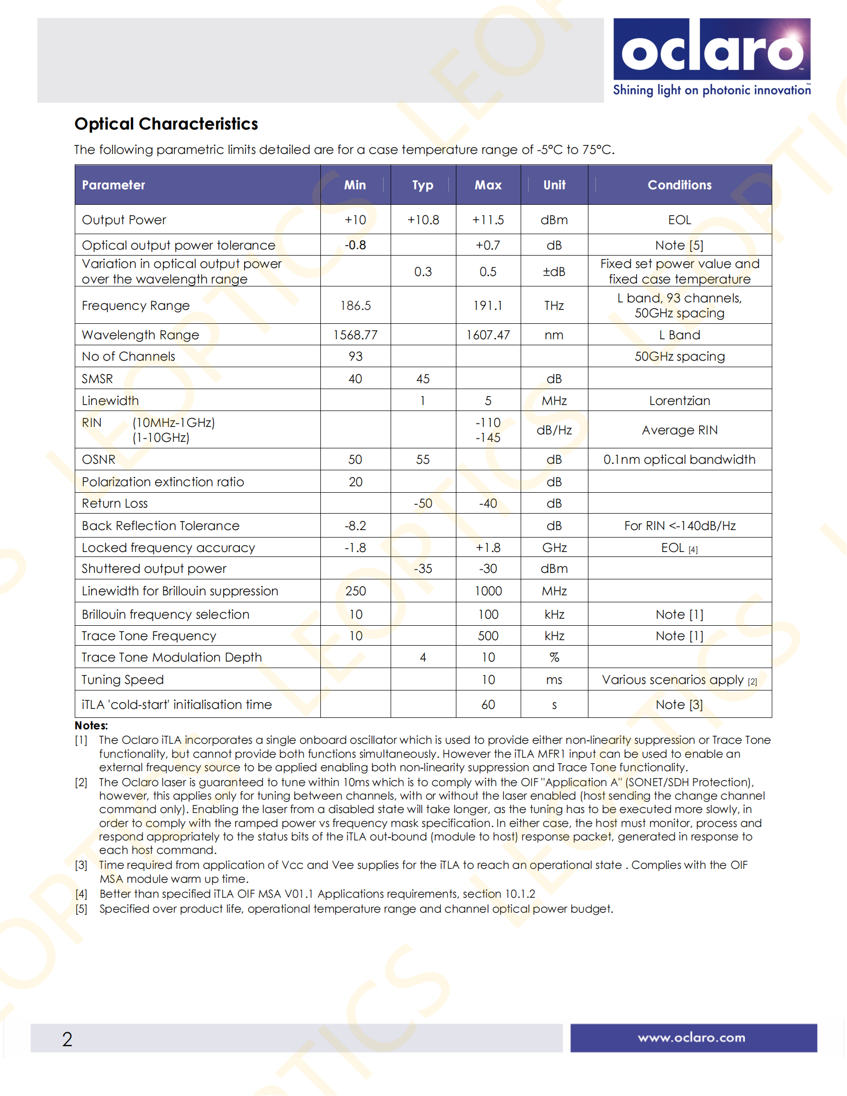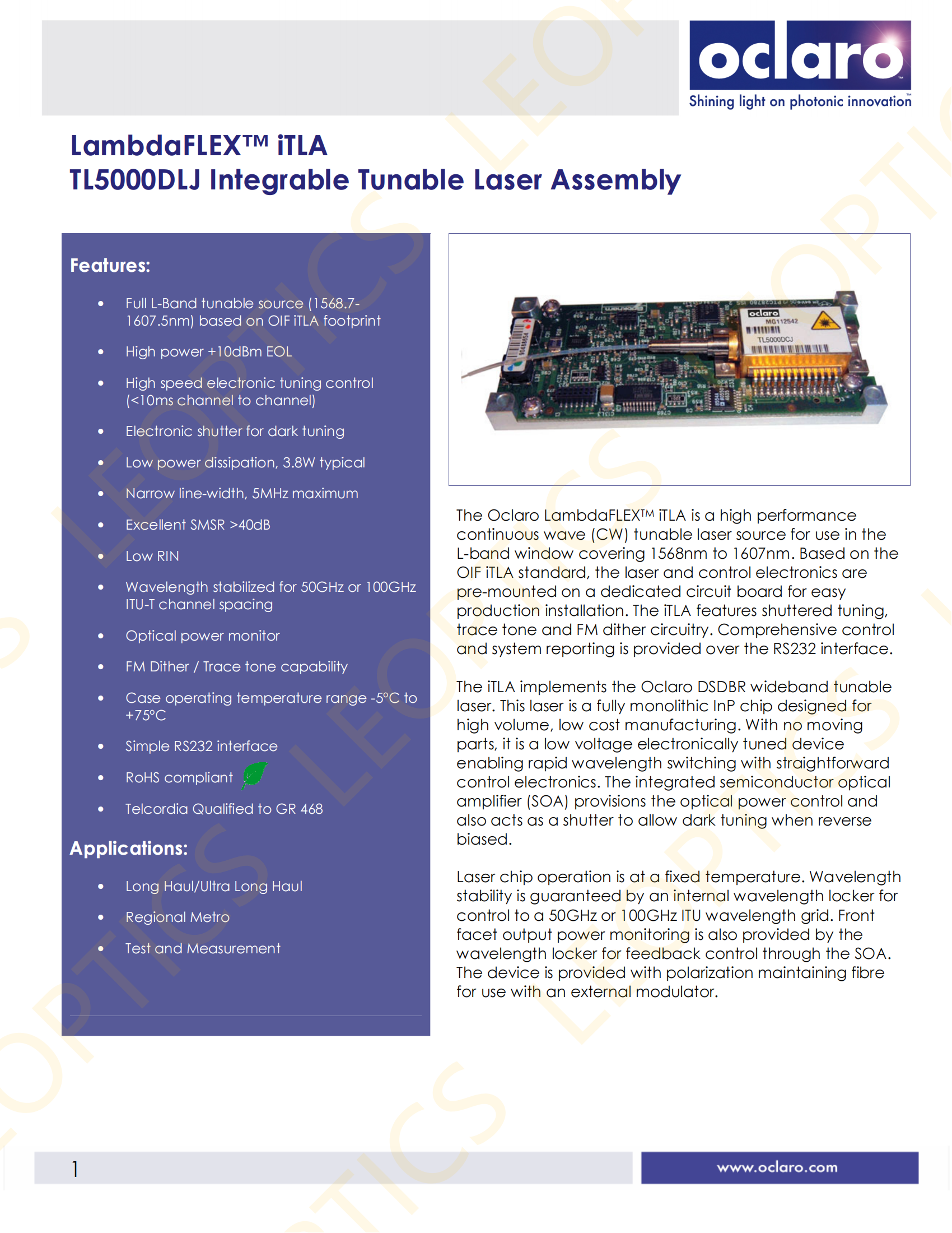 Oclaro TL5000NDR CW L Band Integrable Tunable Laser ITLA 92CH 2-8dBm FC/APC