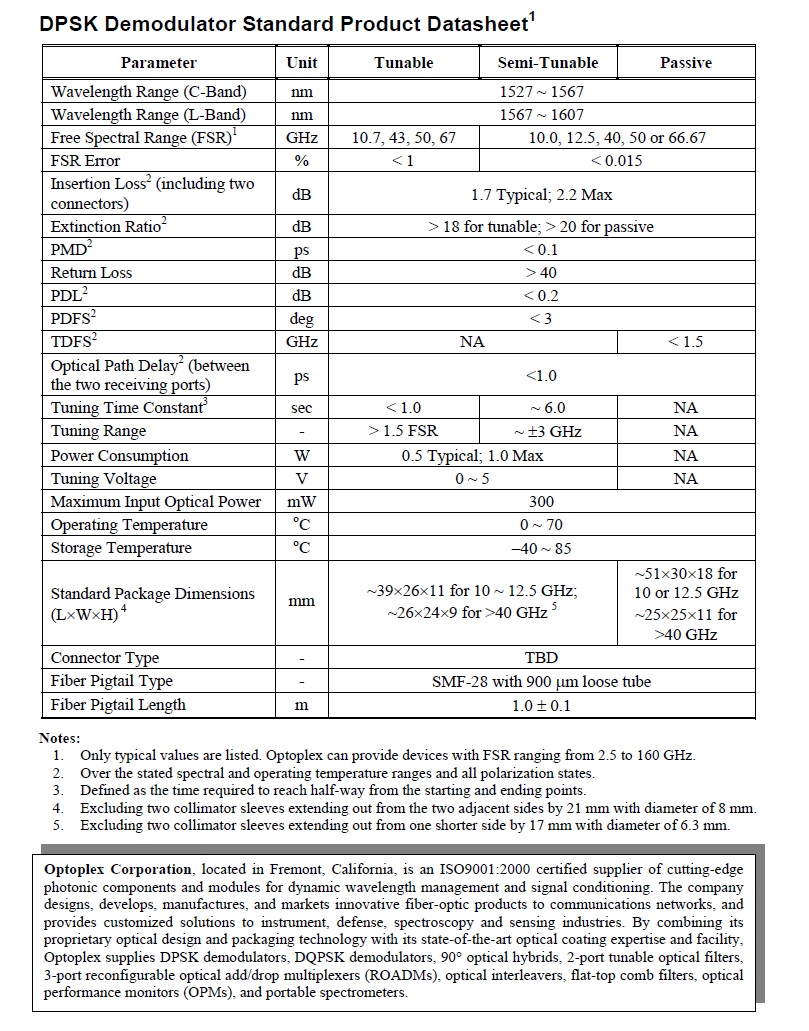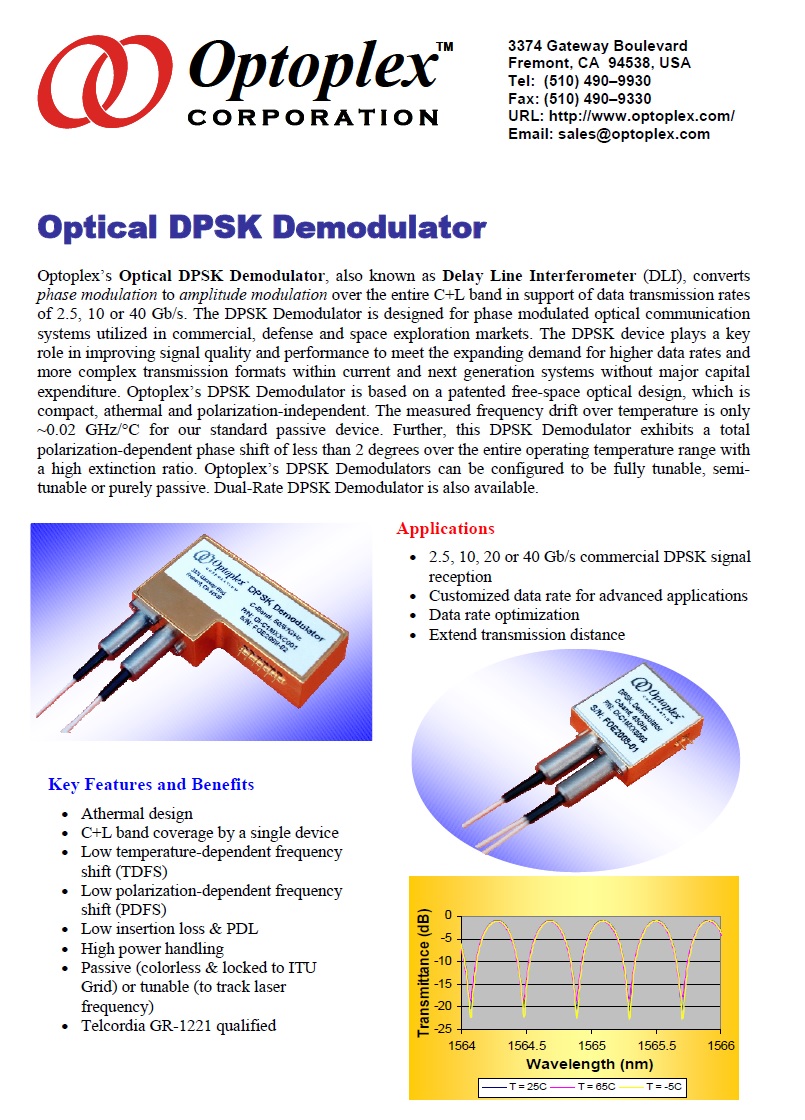 Optoplex 40Gbs Optical DPSK Demodulator DLI C/L Band 1527-1607nm DI-C1MLCC004