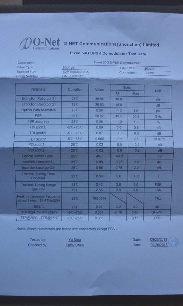 Vo-Net Fixed 50G DPSK Demodulator SMF-28 LC/PC Wide Bandwidth 1DP-500000-03A