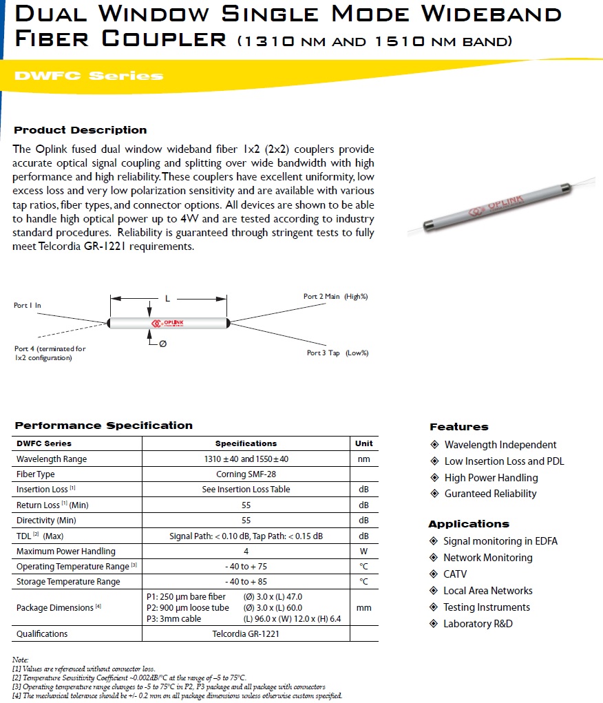 OPLINK Dual Window Single Mode Wideband Fiber Coupler 1310/1510nm DWFC Series