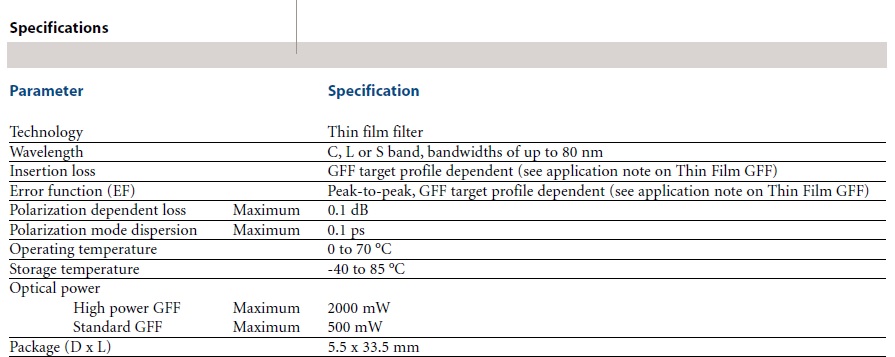 Customized thin film GFFs are available in the C, L, and S bands. All JDSU thin