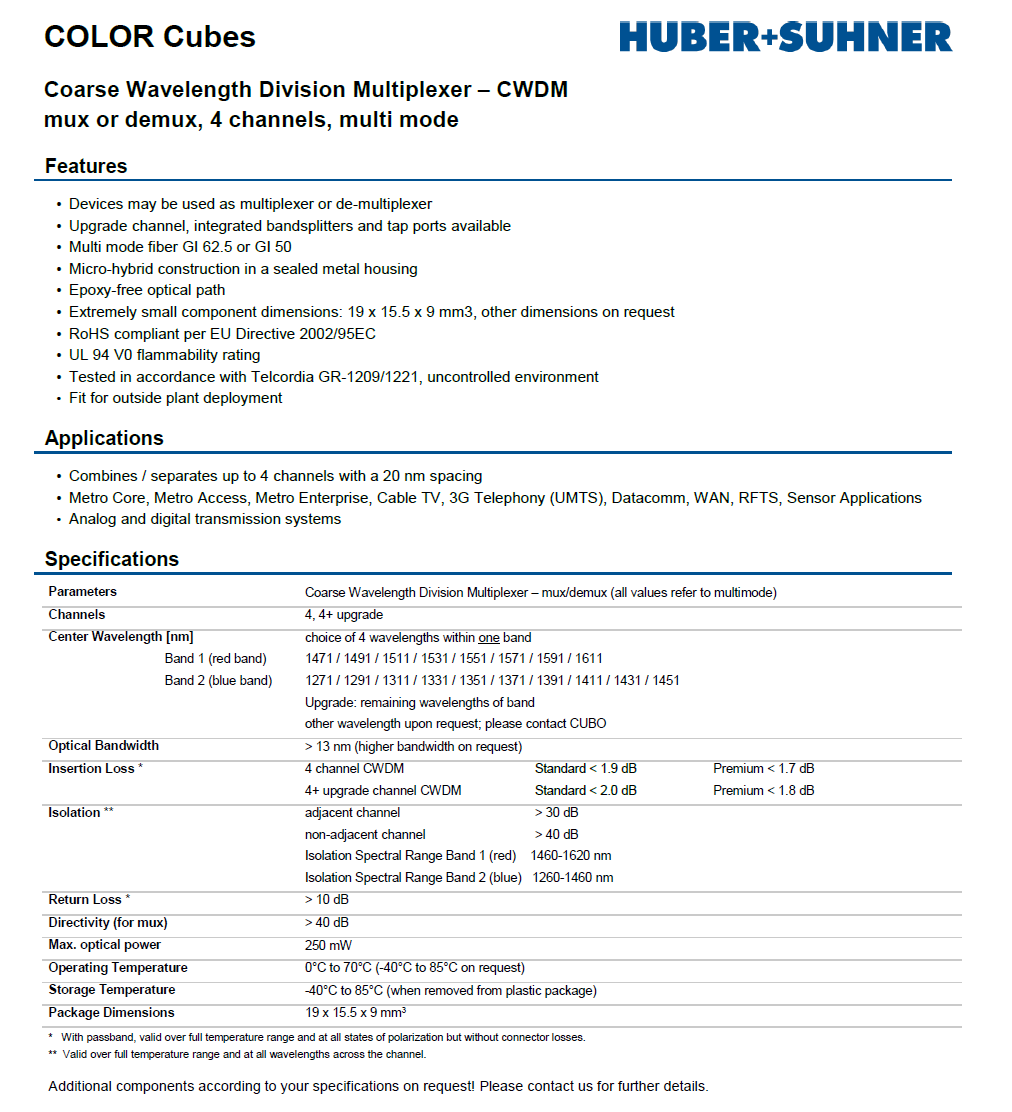 ·Combines / separates up to 4 channels with a 20 nm spacing
