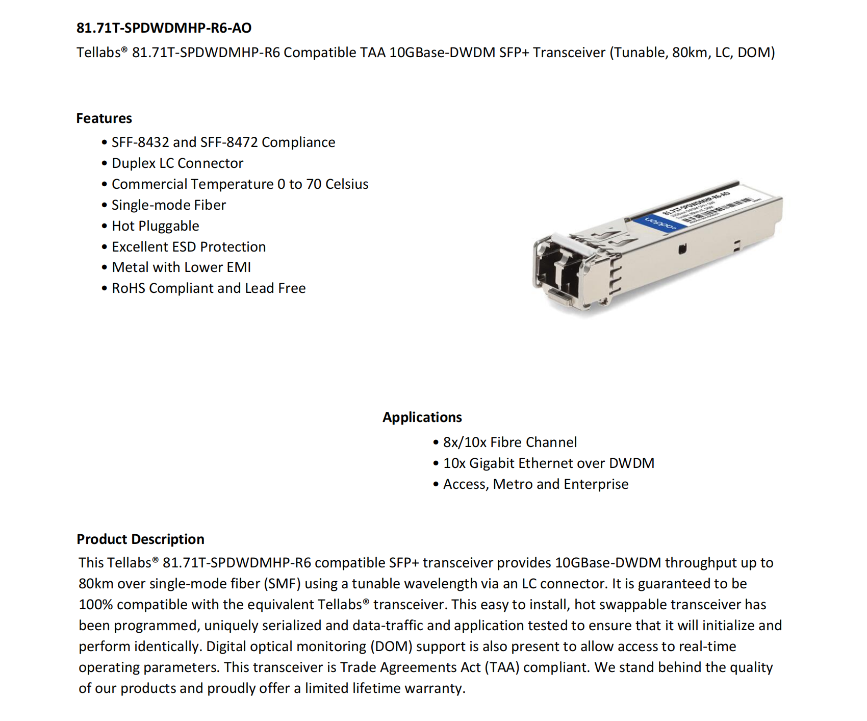 81.71T-SPDWDMHP-R6 compatible SFP+ transceiver provides 10GBase-DWDM throughput up to