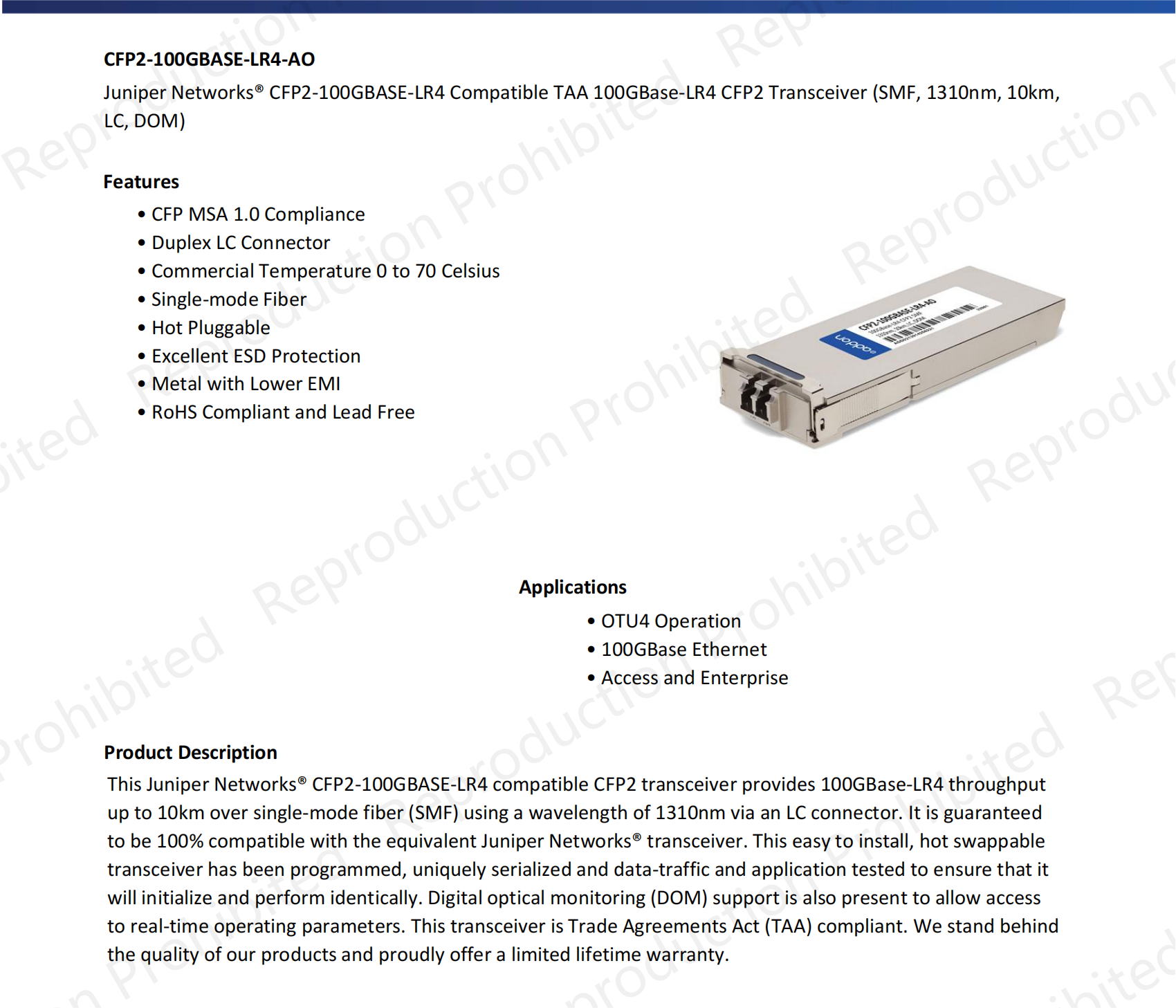 CFP2-100GBASE-LR4 compatible CFP2 transceiver provides 100GBase-LR4 throughput up to 10km over single-mode fiber (SMF) using a wavelength of 1310nm via an LC connector. Our transceiver is built to meet or exceed OEM specifications and is guaranteed to be 100% compatible with Juniper Networks®. It has been programmed, uniquely serialized, and tested for data-traffic and application to ensure that it will initialize and perform identically. All of our transceivers comply with Multi-Source Agreement (MSA) standards to provide seamless network integration. Additional product features include Digital Optical Monitoring (DOM) support which allows access to real-time operating parameters.