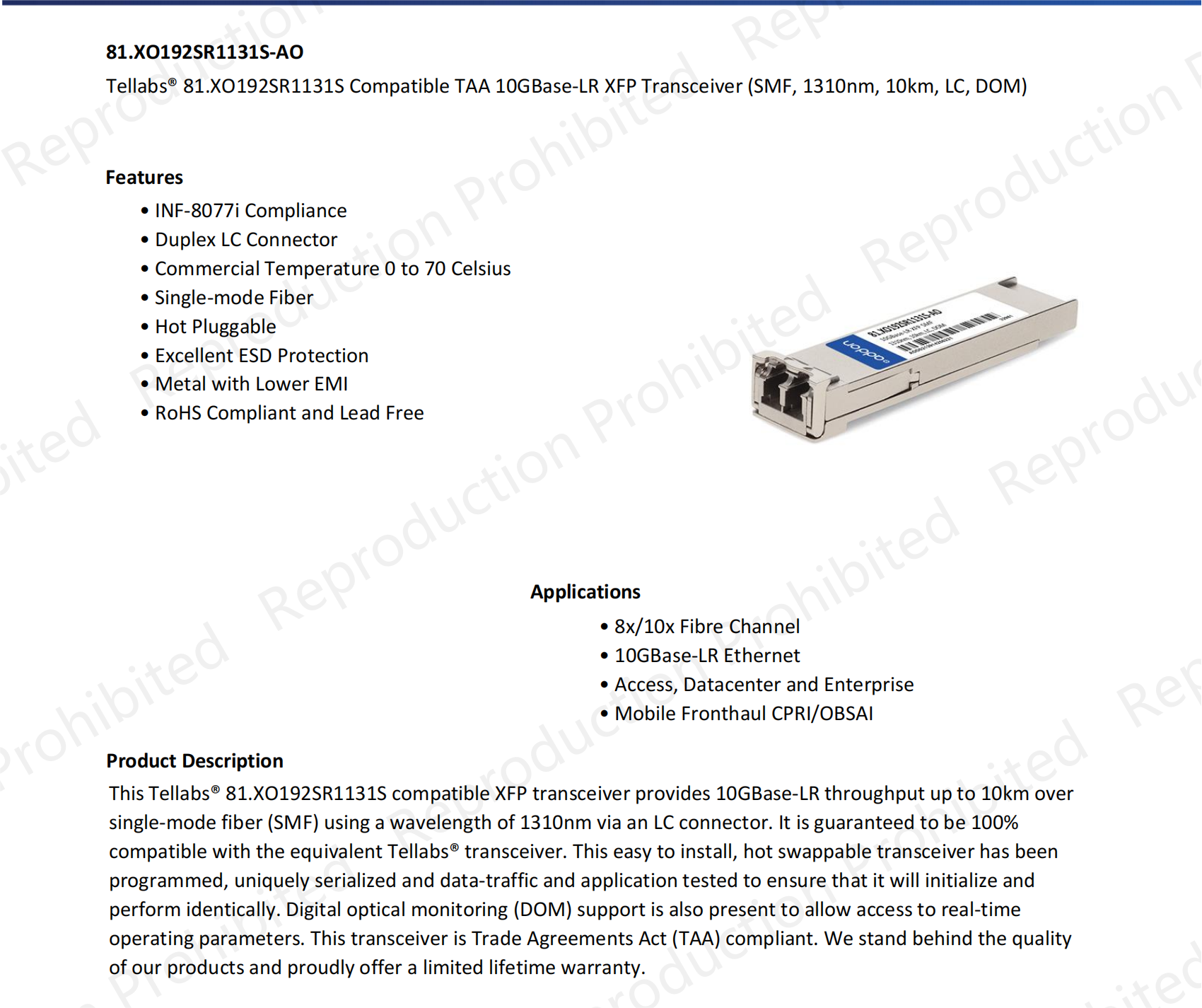 Tellabs® 81.XO192SR1131S Compatible TAA 10GBase-LR XFP Transceiver (SMF, 1310nm, 10km, LC, DOM)