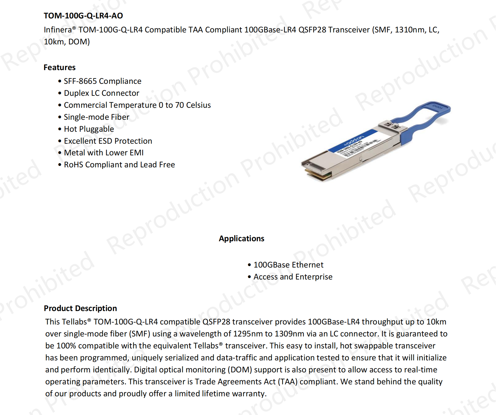 Infinera TOM-100G-Q-LR4 TOM2-100G-Q-LR4100GBase-LR4 QSFP28 Transceiver 10km