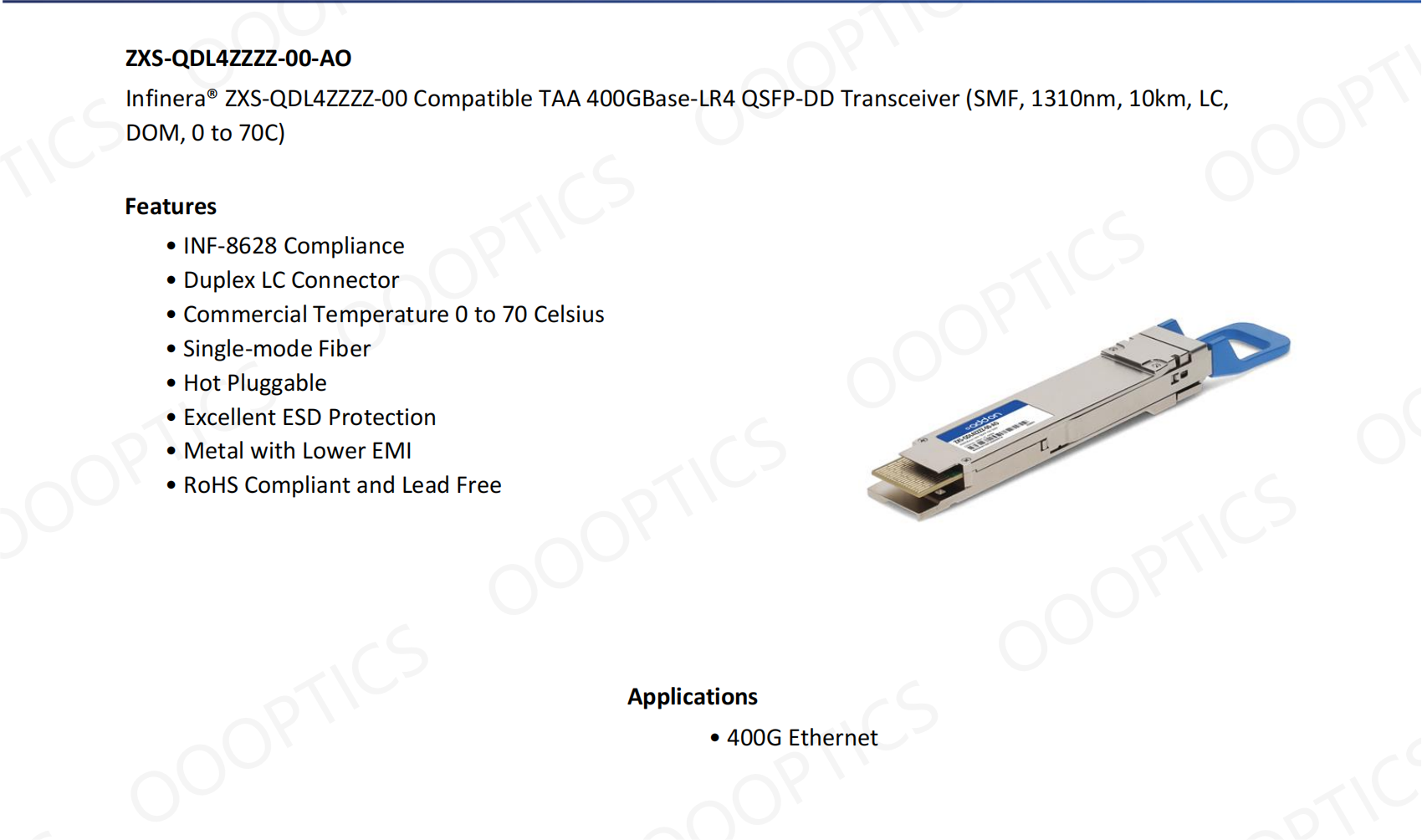 Infinera ZXS-QDL4ZZZZ-00 400GBase-LR4 QSFP-DD Transceiver SMF 1310nm 10KM LC
