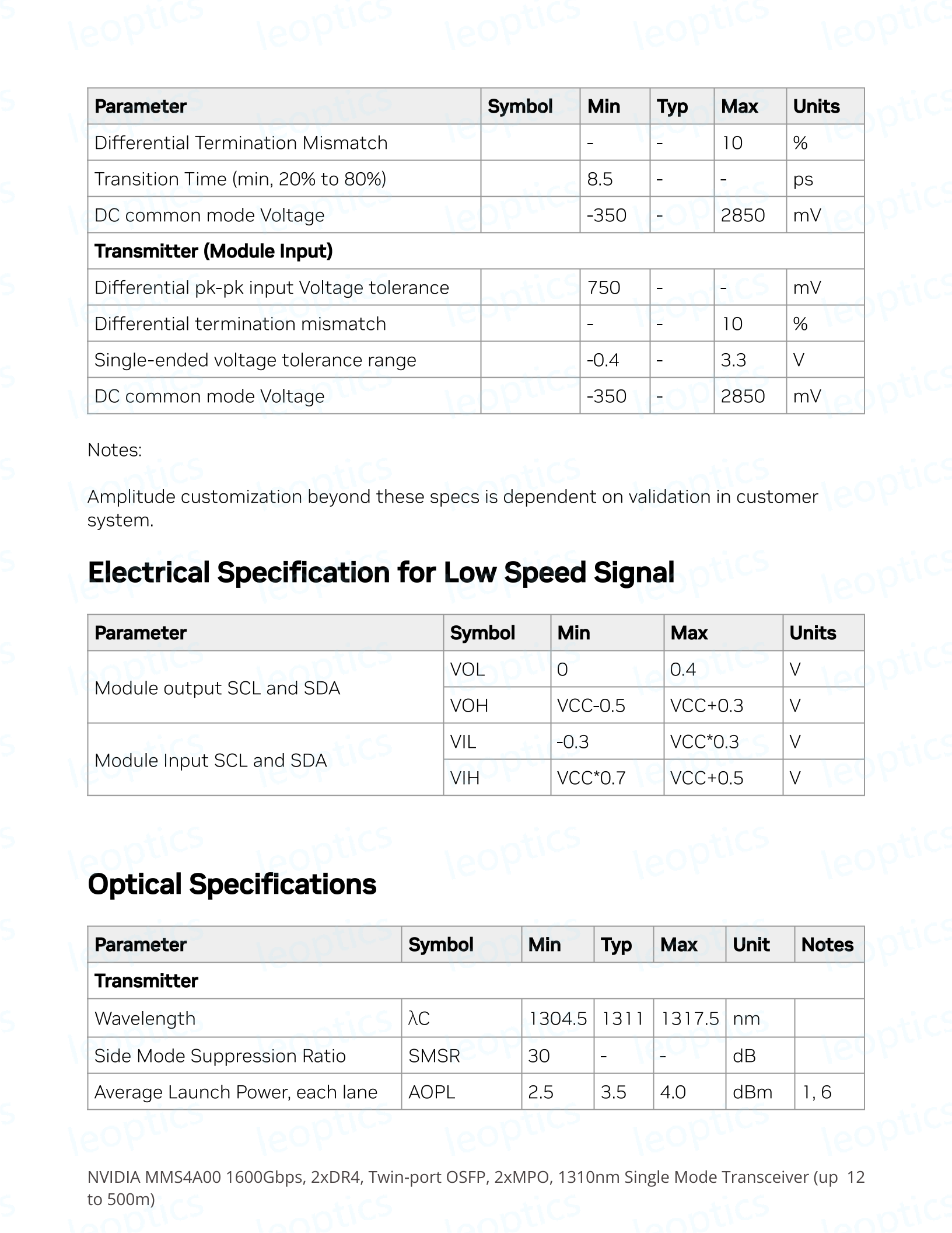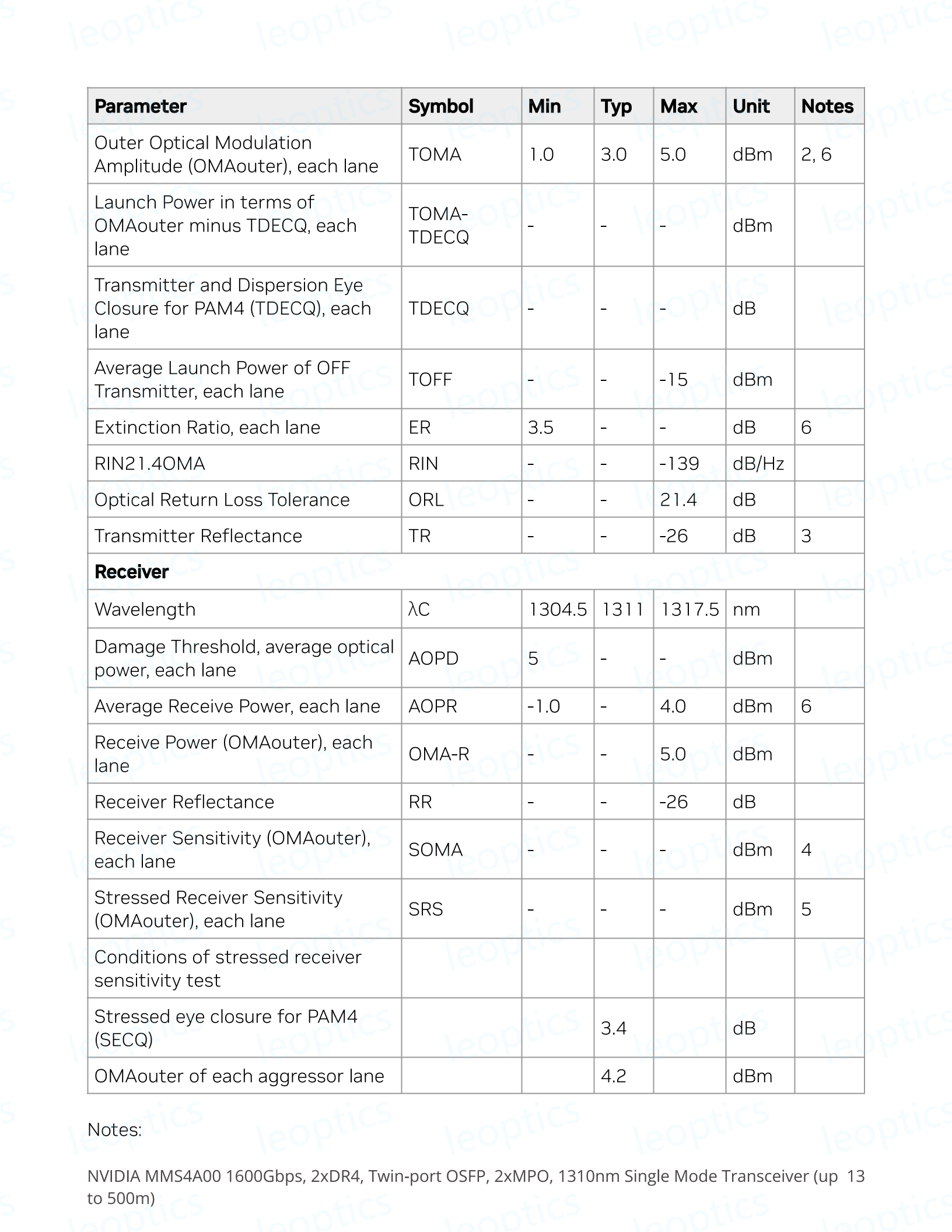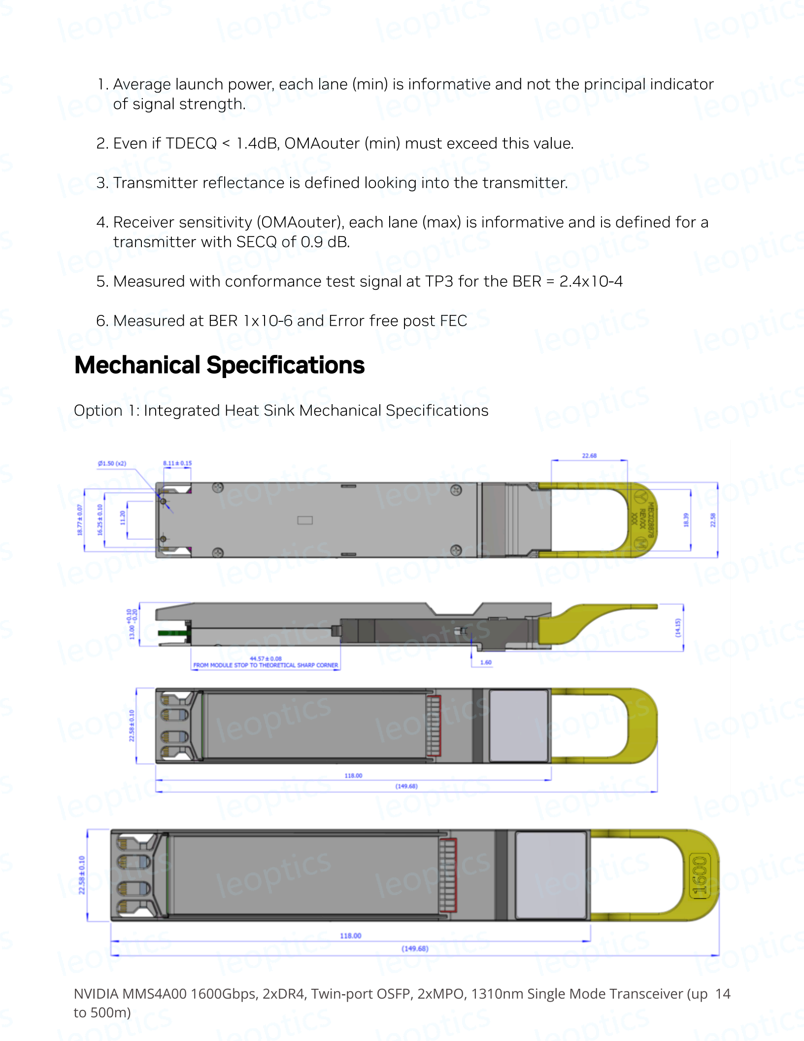 NVIDIA MMS4A00 1600Gbps,2xDR4,双端口 OSFP,2xMPO,1310nm 单模收发器(可达 500米)