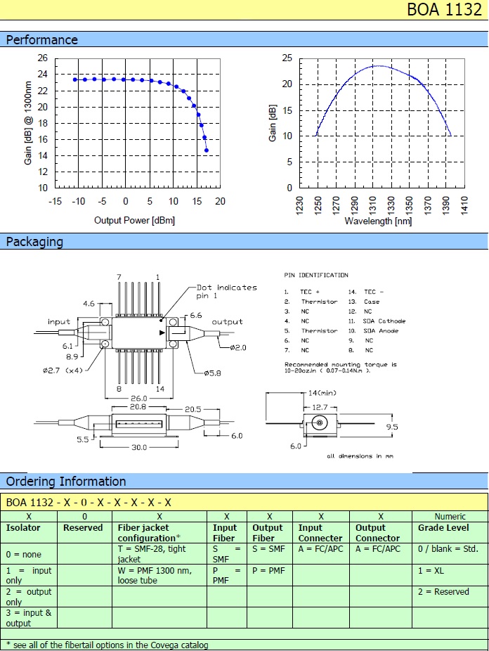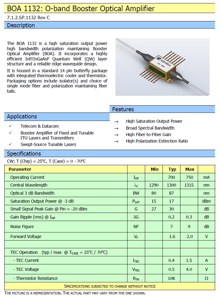COVEGA O-band Booster Optical Amplifier 1300nm High Saturation Output BOA 1132