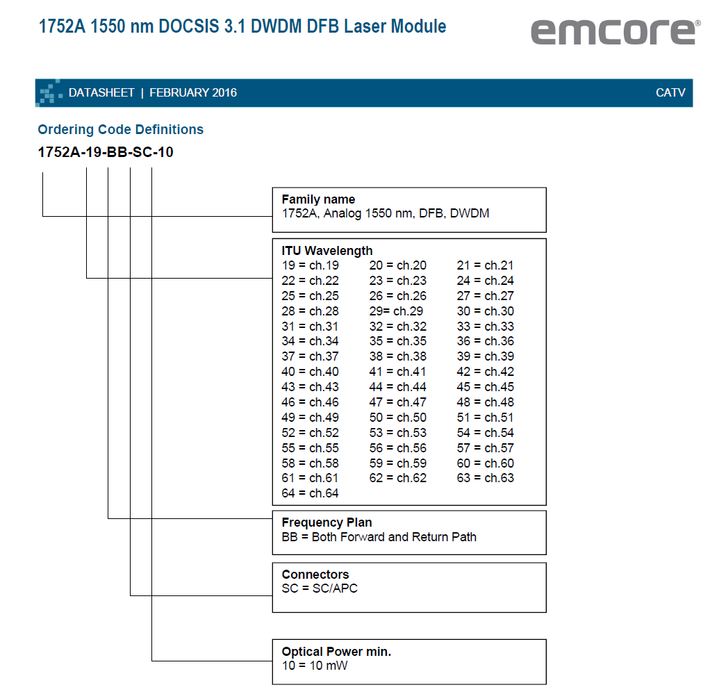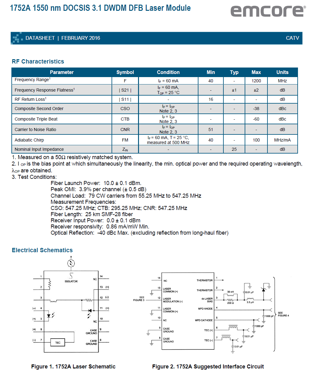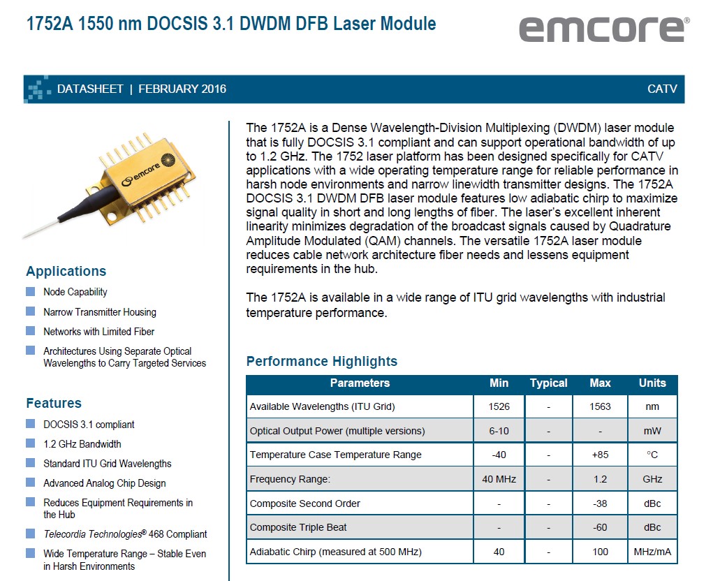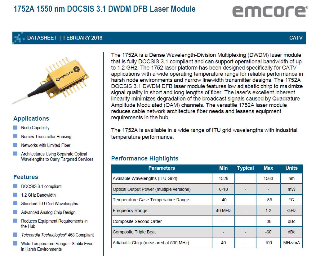 1752A 1550 nm DOCSIS 3.1 DWDM DFB Laser, CATV Application