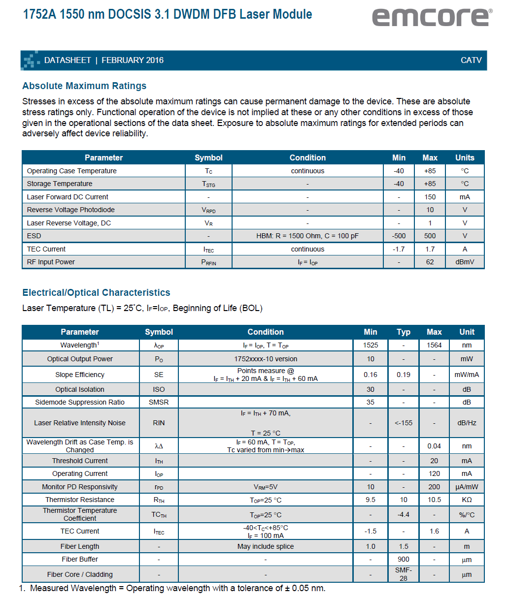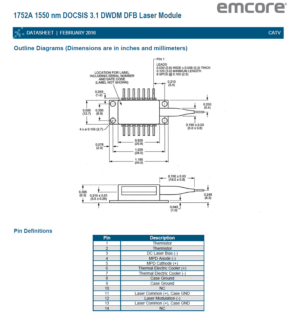 COC CHIP EMCORE 1752A 1550 nm DOCSIS 3.1 DWDM DFB Laser, CATV Application