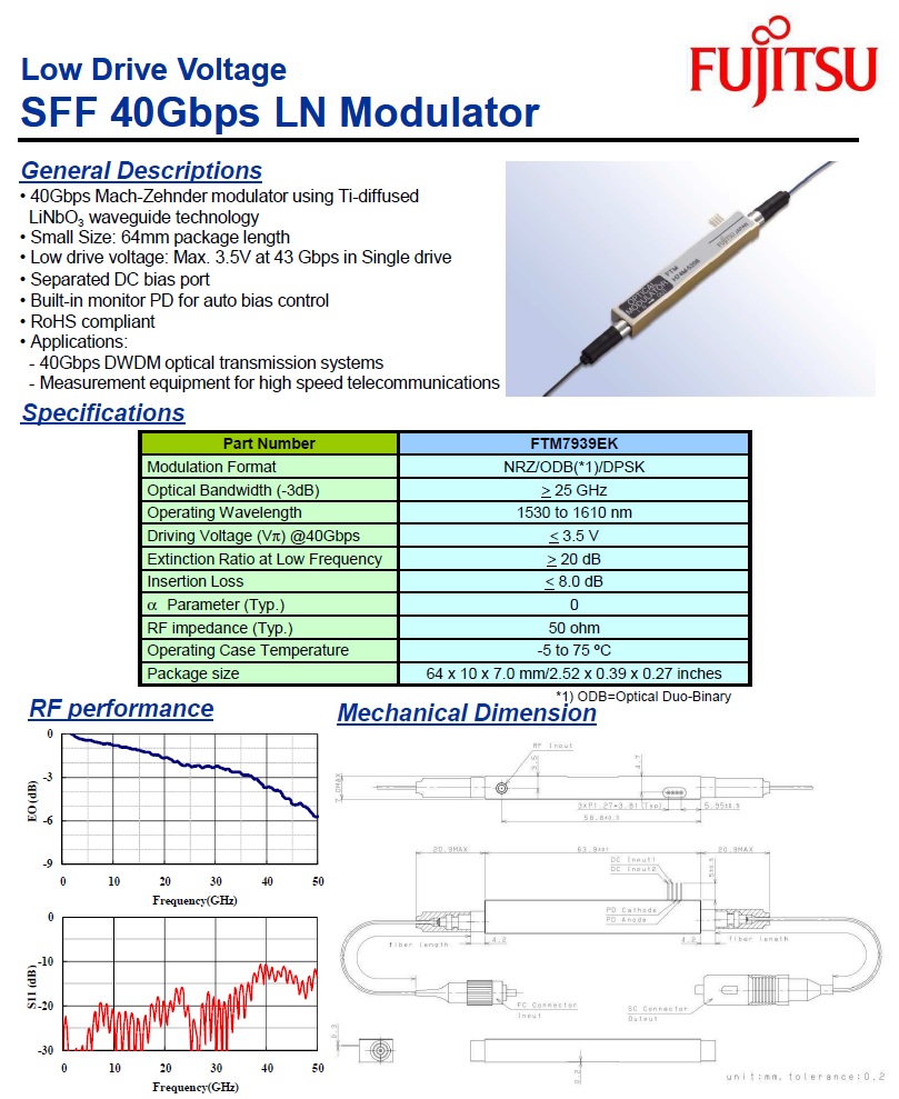 Fujitsu SFF 40Gbs LN Small Size MZ Modulator 1530-1610nm DC Bias Port FTM7939EK