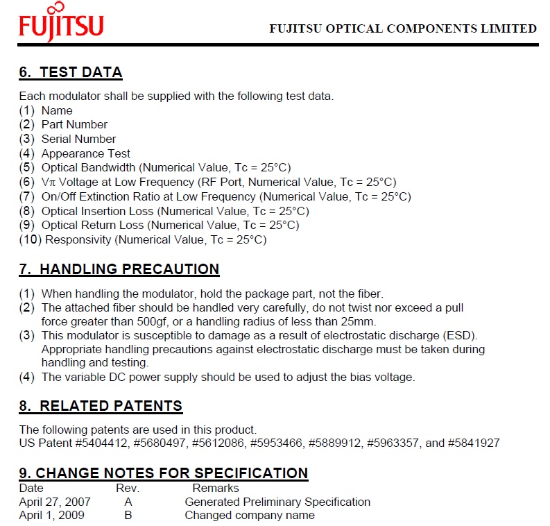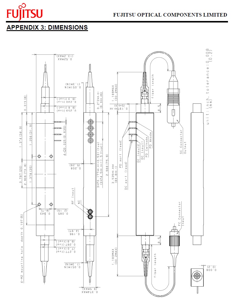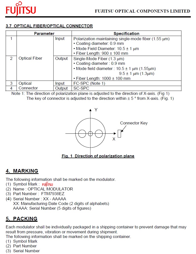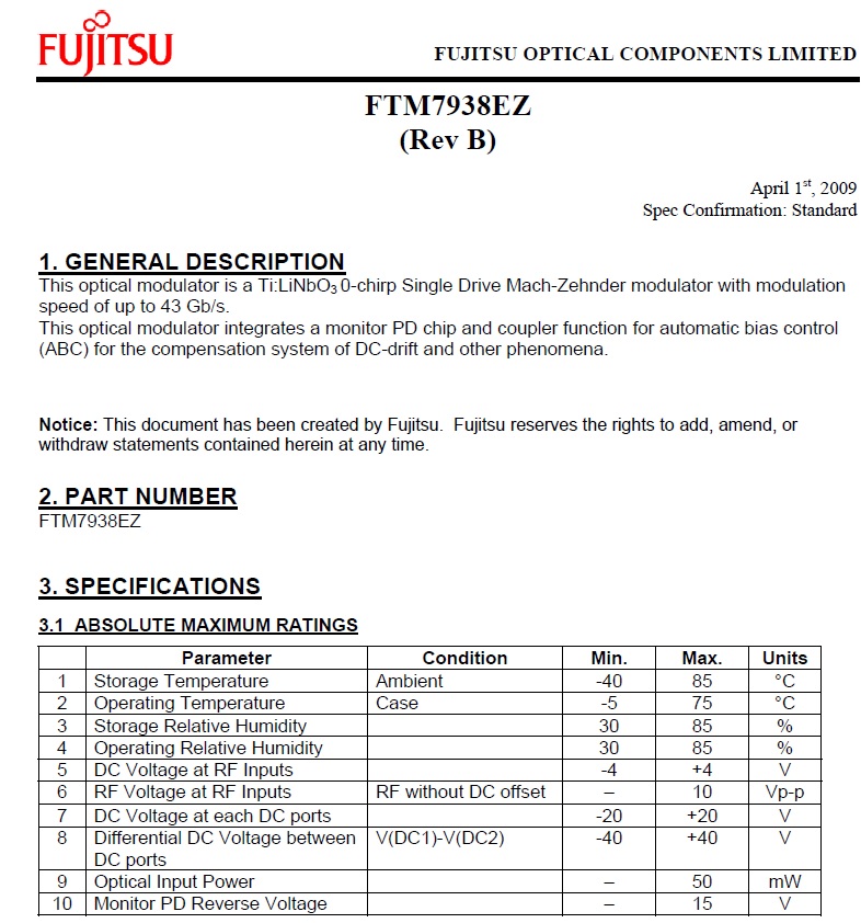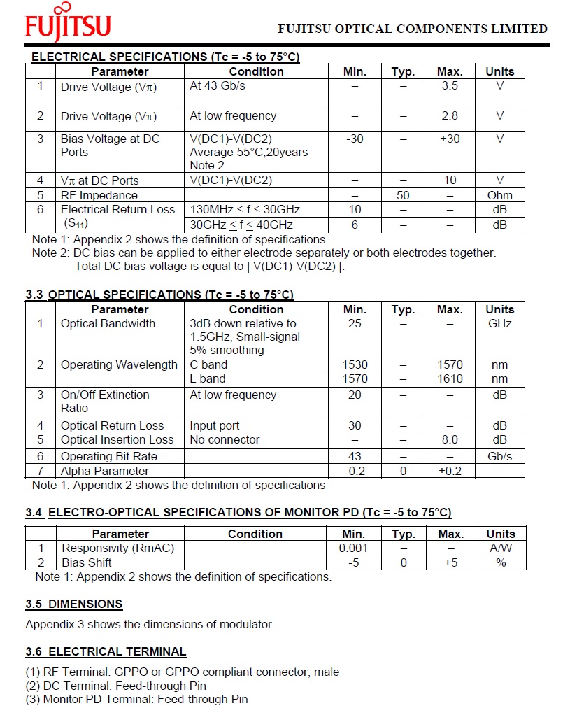 Fujitsu 40Gbs DPSK LN Single Drive MZ Modulator 1530-1610nm RF 50ohm FTM7938EZ