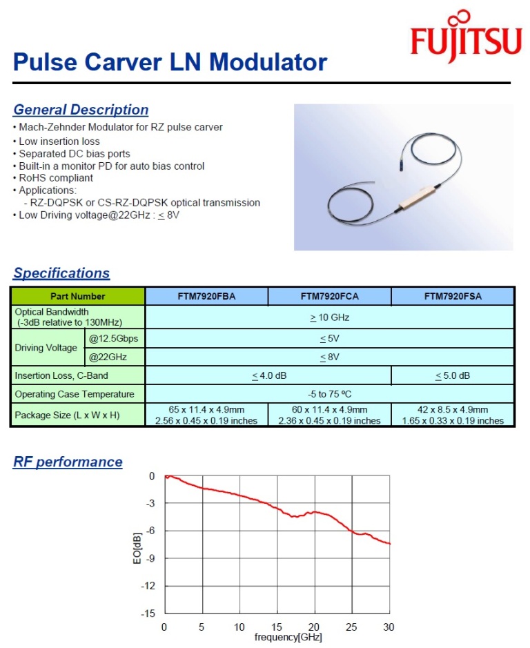 Fujitsu DQPSK 22GHz <8V Single Driver Intensity Modulator C Band GPO FTM7920FSA